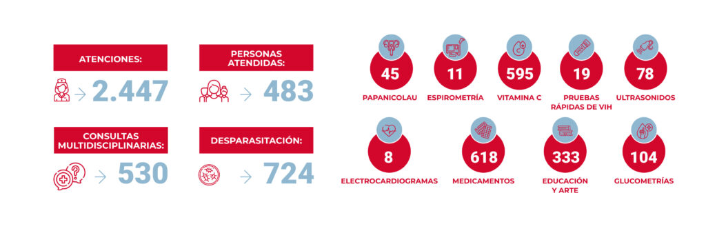 A cada localidad llegaron los módulos de farmacia, pruebas rápidas de VIH, nutrición, psicología, imagenología, rehabilitación, aplicación de PAP, educación y arte y desparasitación; este último especialmente importante en las comunidades de difícil acceso debido a la falta de sistemas de desagüe adecuados y la contaminación del agua, razón por la cual se proporcionó material de desparasitación adaptado a las necesidades de cada familia atendida.